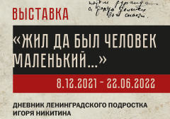 8 декабря 2021 года в 17.00 в Государственном мемориальном музее обороны и блокады Ленинграда (Соляной пер., д. 9) состоится открытие выставки из цикла «Семейные истории»: «Жил да был человек маленький…», основанной на блокадном дневнике ленинградского подростка Игоря Никитина.
