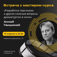19 апреля 2022 в 20.00 состоится встреча с мастером курса “Разработка персонажа и другие сложные вопросы драматургии в кино” (старт курса – конец апреля), Анной Ганшиной.